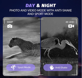 دوربین دوچشمی دید در شب، ویدیوی 4K HD و عکسهای 36 مگاپیکسلی را ارائه میدهد. هنگام فیلمبرداری از حیوانات در حال دویدن، میتوان قابلیت تشخیص حرکت را فعال کرد همچنین تصاویر دارای قابلیت ضد لرزش هستند.