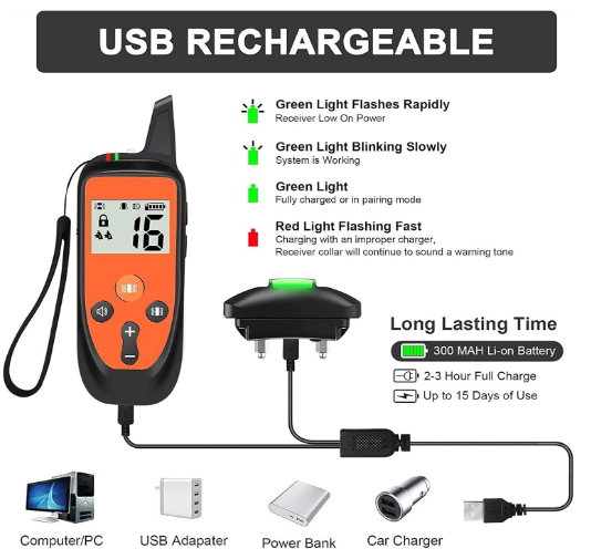 ۳ ماه آماده به کار پس از روشن شدن، ۱۵ روز استفاده. باتری قابل شارژ USB با کیفیت بالا میتواند تا ۱۵ روز زمان آماده به کار را فراهم کند. عمر باتری طولانی و سیگنال پایدار برای اطمینان از آموزش طولانی مدت و بدون وقفه سگ. ریموت کنترل و قلاده را میتوان به سرعت در ۳ ساعت شارژ کرد.