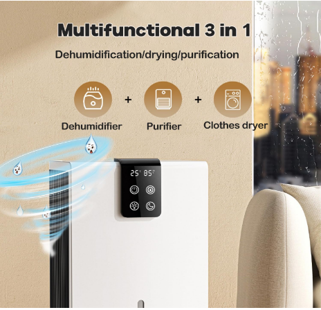 رطوبتگیر / خشککن لباس / تصفیه یون منفی رطوبتگیر چندمنظوره سه در یک، مجهز به فیلتر PET با چگالی بالا، کربن فعال دو لایه، فیلتراسیون مؤثر گرد و غبار، دود سیگار، باکتریها و سایر مواد مضر موجود در هوا.