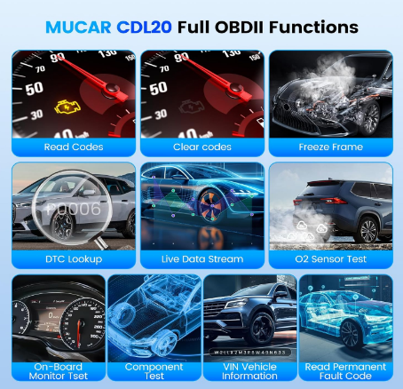 چرا دستگاه تشخیص mucar CDL20 را انتخاب کنید؟ این تجهیز از 11 حالت عملکرد تشخیصی OBDII پشتیبانی می کند: خواندن کدها، پاک کردن کدها، Live data، تست سیستم EVAP، تست on board monitor، تست سنسور O2، نمایش Freeze frame، نمایش اطلاعات خودرو، I/M readiness ، خواندن کد DTC، جستجو همه وسایل نقلیه مطابق با OBDII، کتابخانه داخلی DTC، نیازی به جستجوی آنلاین ندارید، می توانید ببینید که آیا ماشین شما نیاز به نگهداری دارد یا خیر.