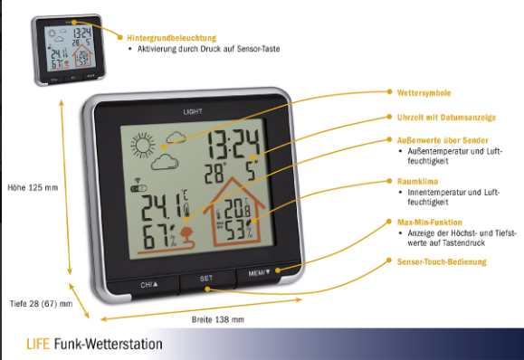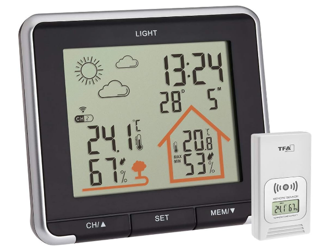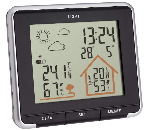 این دستگاه بی سیم، قادر است دما و رطوبت خانه و فضای بیرون خانه را نمایش دهد. اطلاعات مربوط به داخل منزل در نمایشگر، داخل طرح شماتیکی خانه قرار گرفته اند و اطلاعات مربوط به فضای بیرون در طرح شماتیکی درخت نوشته می شوند. زمان و تاریخ هم در بالای صفحه نمایش داده می شود.