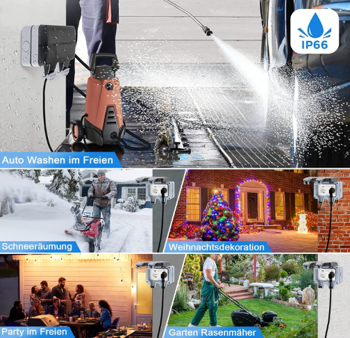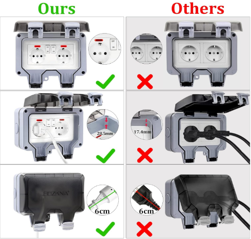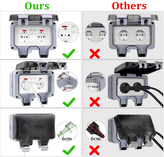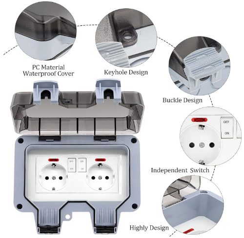 سوکت دوتایی ضد آب دارای کلید داخلی مستقل، چراغ نشانگر و کاور قابل قفل برای جلوگیری از باز شدن تصادفی و محافظت در برابر کودکان است. با این محصول دیگر نیازی به کشیدن دوشاخه از پریز ندارید و می توانید از کلید کوچک روی پریز جهت کنترل آن استفاده کنید. این پریز دارای گواهینامه CE و ROHS است.