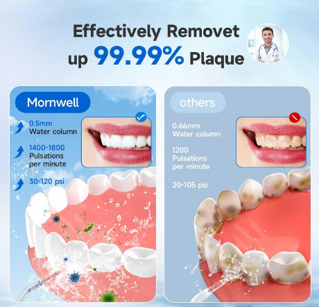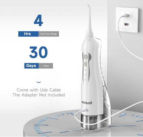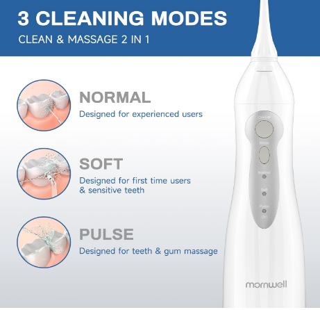 واترجت شارژی Mornwell ضد آب (IPX7) است، بنابراین به سادگی در مواقع استحمام قابل استفاده است. همچنین دارای مخزن آب بسیار بزرگ 300 میلی لیتری با جریان آب در حدود 60 ثانیه است و می توانید بدون نیاز به پر کردن مجدد آب، تمام مراحل تمیز کردن دهان خود را طی کنید. .