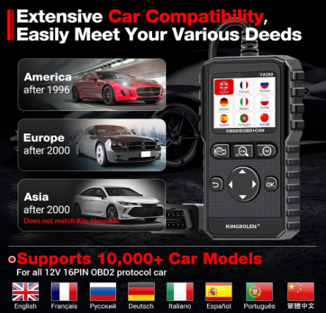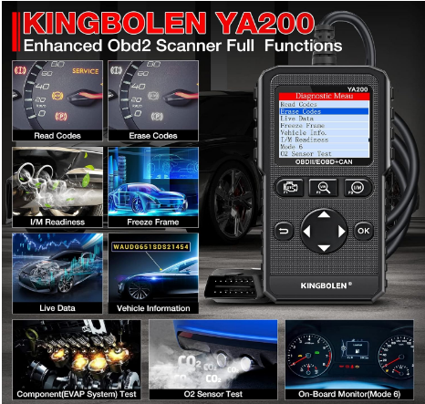 اسکنر OBD2 مدل YA200 از تمامی فانکشن های OBD2 نظیر خواندن و پاک کردن کدها، مشاهده جریان داده، I/M readiness جهت چک کردن میزان آلایندگی خودرو، اطلاعات خودرو، چک کردن سنسور اکسیژن، تست onboard monitor و تست اجزا (EVAP system) پشتیبانی میکند. همچنین این دستگاه قابلیت خواندن و پاک کردن کدهای خطا را دارد و میتواند چراغ چک موتور را خاموش کند.